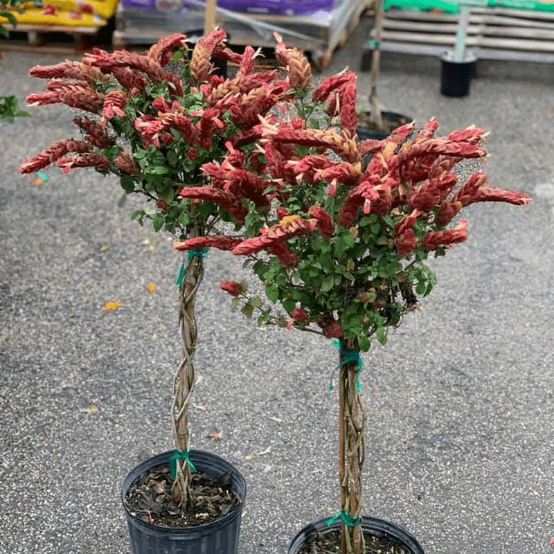 J. brandegeeana is a bushy evergreen shrub growing to 100 cm (39 in) tall by 60–90 cm (24–35 in) broad. The stems and leaves are downy. The leaves are variegated and usually grow in clusters on the branches. As the plant receives more sun, the amount of creamy white on the speckled leaves will increase, and vice versa. The flowers emerge from bracts that form off the stems. The bracts start out white, but with more sun exposure they turn anywhere from pale pink to deep salmon. A chain of bracts will continue to grow until it falls off in most cases; thus the chains can grow anywhere from a few inches to nearly a foot in length. Flowers emerge from the bracts; usually, they are long, thin, and white with speckled maroon throats.